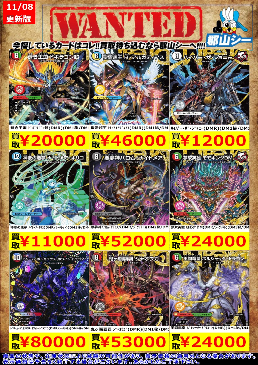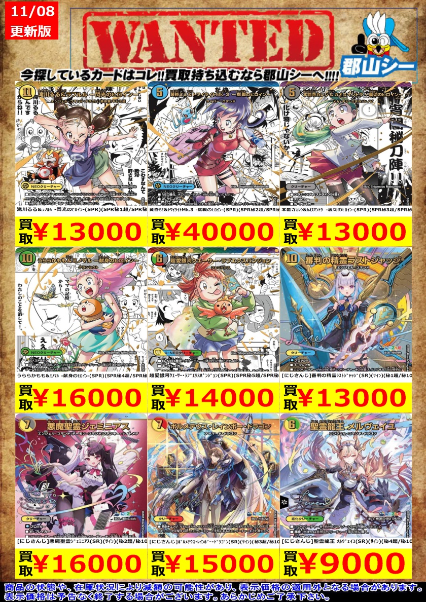 シーガル郡山店デュエマお買取り情報!! ※商品の状態や在庫状況により減額の可能性があり、表示価格の適用外となる場合がございます。 本能寺カレン&カオスマントラ -裏切のヒロイン-(SPR)(SPR秘3超/SPR秘5) ¥13,000 [にじさんじ]聖霊龍王 メルヴェイユ(SR)(サイン)(秘4超/秘10) ¥9,000