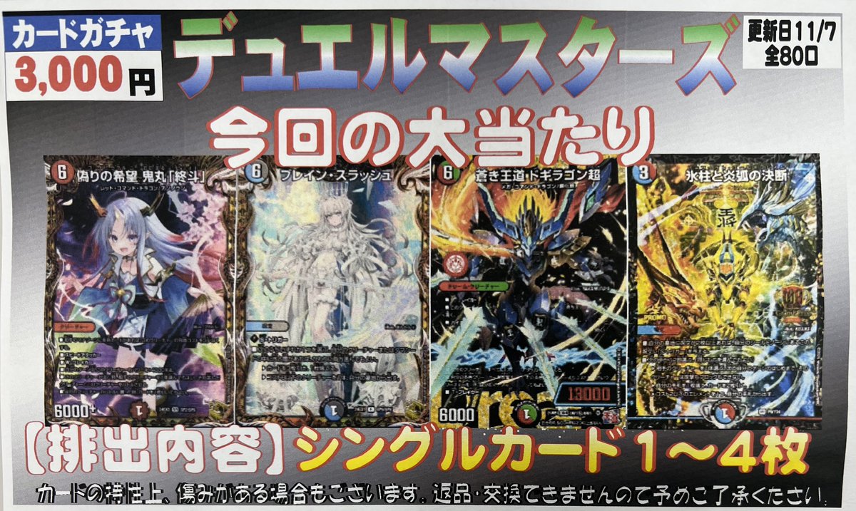 こんばんは! デュエマ3000円自販機をリニューアル致しました‼️ 鬼丸終斗 金トレジャーやドギラゴン超 シークレットなどが当たります✨️ ハズレでも優良カードが排出︎💕︎︎ 是非ぜひお試しください(*´ω`*)