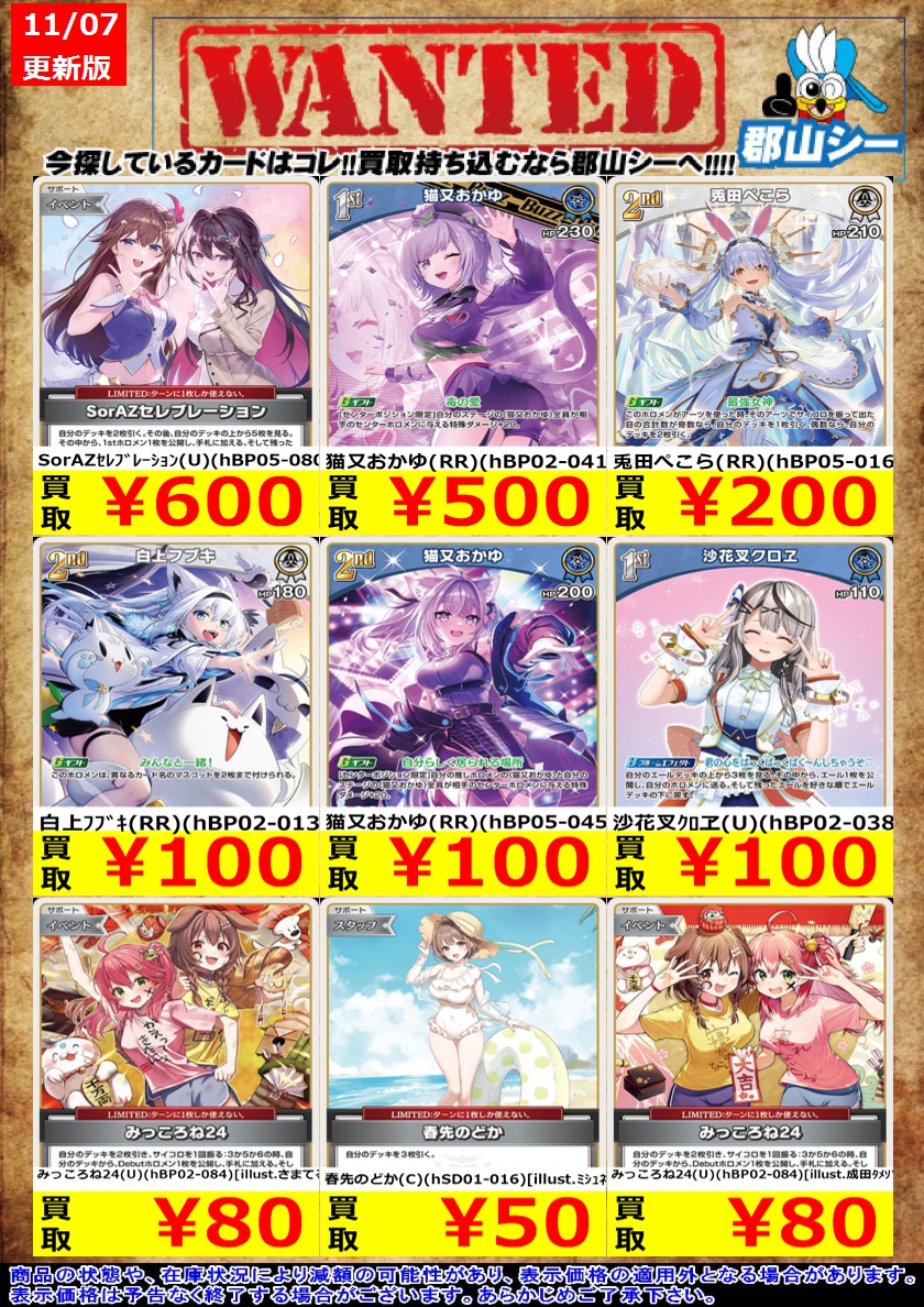 シーガル郡山店ホロライブOCGお買取り情報!! ※商品の状態や在庫状況により減額の可能性があり、表示価格の適用外となる場合がございます。 百鬼あやめ(UR)(hBP02-034) ¥3,500 兎田ぺこら(UR)(hBP01-043) ¥500 AZKi(UR)(hBP01-047) ¥300