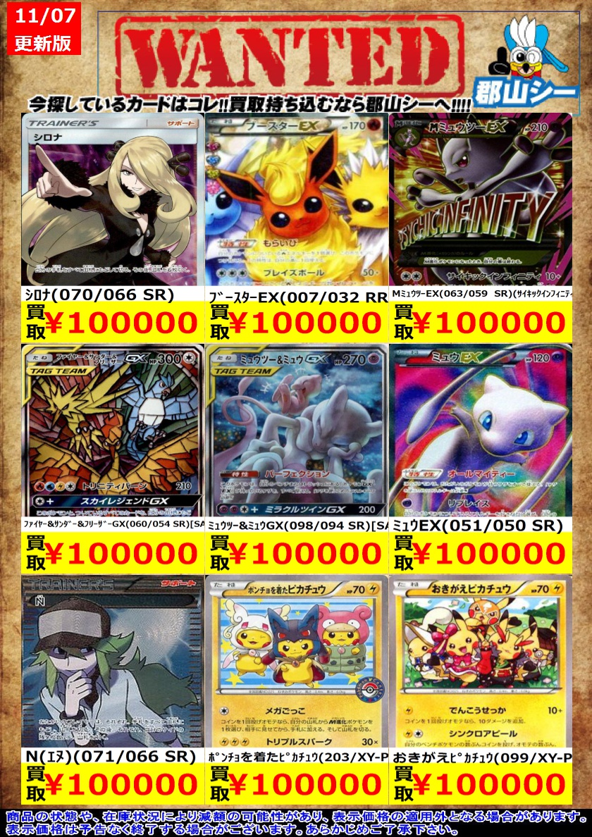 シーガル郡山店ポケカ数量限定お買取り情報更新です!よろしくお願いいたします! ※商品の状態や在庫状況により減額の可能性があり、表示価格の適用外となる場合がございます。 ブラッキー(188/BW-P) ¥85,000 ピカチュウ(154/XY-P) ¥85,000 シェイミEX(212/XY-P) ¥85,000