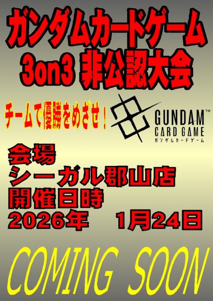 こんにちは(」・ω・) シーガル郡山店の田中です‼️ 来る1月24日……. ガンダムカード 3on3非公認大会 開催が決定致しました‼️ 詳細等は後日改めて発表とさせて頂きます。 沢山のご参加お待ちしております(*^^*) #GCG #ガンダムカード