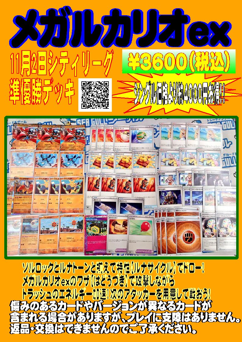 シーガル郡山店です! ポケモンカード 大会で活躍中 メガルカリオex のデッキ作成しました!! シングルで揃えるよりも4000円お得です!! 店頭ファイルでも内容ご確認いただけます! ご来店お待ちしております😊 #シーガル郡山店デッキ販売