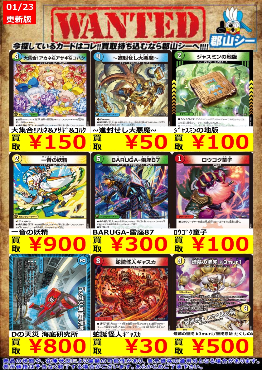 シーガル郡山店デュエマノーマルお買取り情報!! ※商品の状態や在庫状況により減額の可能性があり、表示価格の適用外となる場合がございます。 ~進封せし大悪魔~ ¥50 ジャスミンの地版 ¥100 大集合!アカネ&アサギ&コハク ¥150