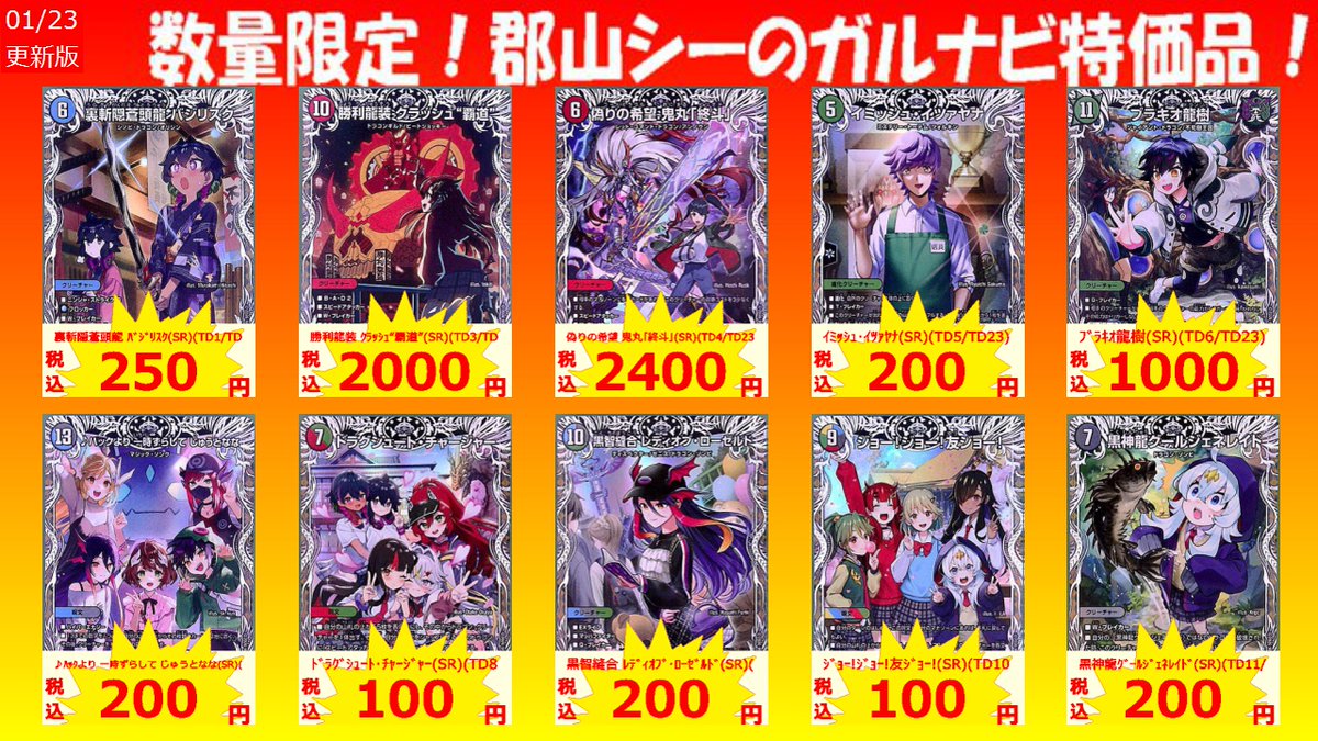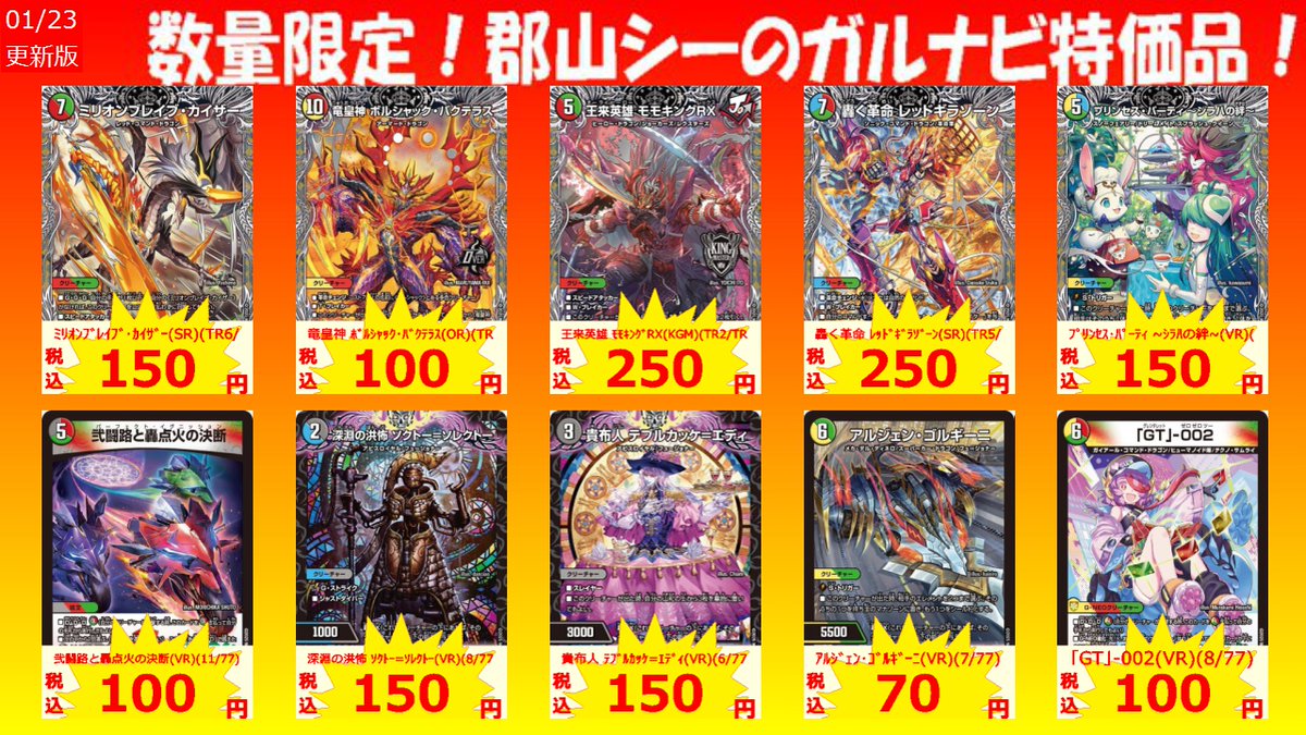 数量限定!郡山シー限定ガルナビ特価品 剣轟の団長 ドギラゴン王道(DMR)(DM1/DM1) ¥3,700 青寂の精霊龍 カーネル/サイレント・ジェラシー(U)(81/105) ¥100 終止の時計 ザ・ミュート(R)(TD20/TD23) ¥250 #デュエマ #シーガル郡山 #アツアツ特価