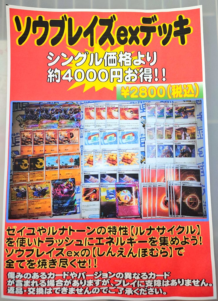 シーガル郡山店です! ポケモンカード構築済みデッキ ソウブレイズexデッキ を作成しました! シングルで揃えるよりも 約4000円オトク!‼️ #シーガル郡山店デッキ販売 お手頃価格使いやすいデッキです! ポケモンカード始めてみませんか? ご来店お待ちしております😊