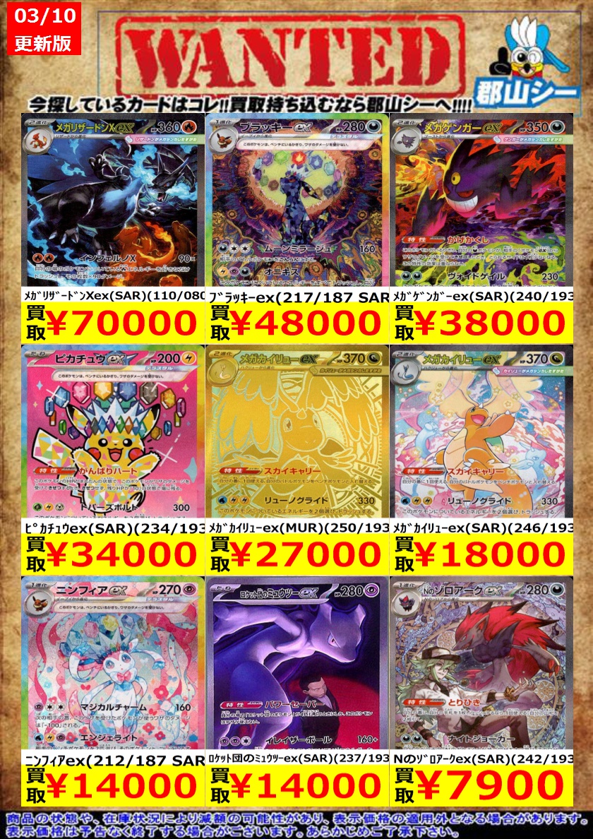 シーガル郡山店ポケカ数量限定お買取り情報更新です!よろしくお願いいたします! ※商品の状態や在庫状況により減額の可能性があり、表示価格の適用外となる場合がございます。 トウコ(166/086 SR) ¥2,800 ロケット団のミュウツーex(SAR)(237/193) ¥14,000