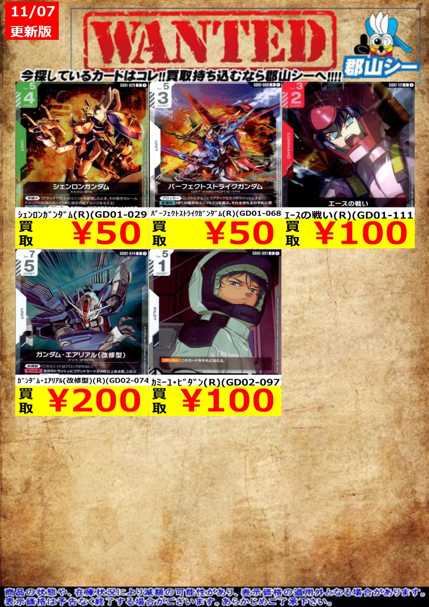 シーガル郡山店ガンダムCGお買取情報!! ガンダム・エアリアル(改修型)(R)(GD02-074) ¥200 カミーユ・ビダン(R)(GD02-097) ¥100 エースの戦い(R)(GD01-111) ¥100