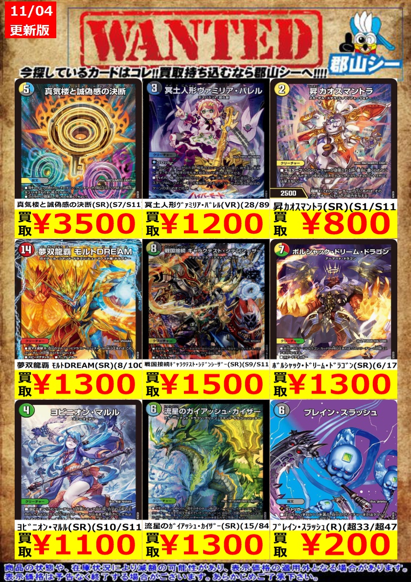 シーガル郡山店デュエマお買取り情報!! ※商品の状態や在庫状況により減額の可能性があり、表示価格の適用外となる場合がございます。 冥土人形ヴァミリア・バレル(VR)(28/89) ¥1,200 真気楼と誠偽感の決断(SR)(S7/S11) ¥3,500 昇カオスマントラ(SR)(S1/S11) ¥800