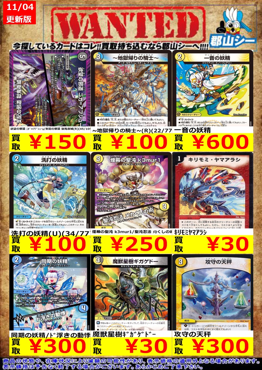 シーガル郡山店デュエマノーマルお買取り情報!! ※商品の状態や在庫状況により減額の可能性があり、表示価格の適用外となる場合がございます。 洗打の妖精(U)(34/77) ¥100 ~地獄帰りの騎士~(R)(22/77) ¥100 欲望の邪道 ニガ=アブシューム/支配の邪道 獄鬼夜城(R)(45/105) ¥150