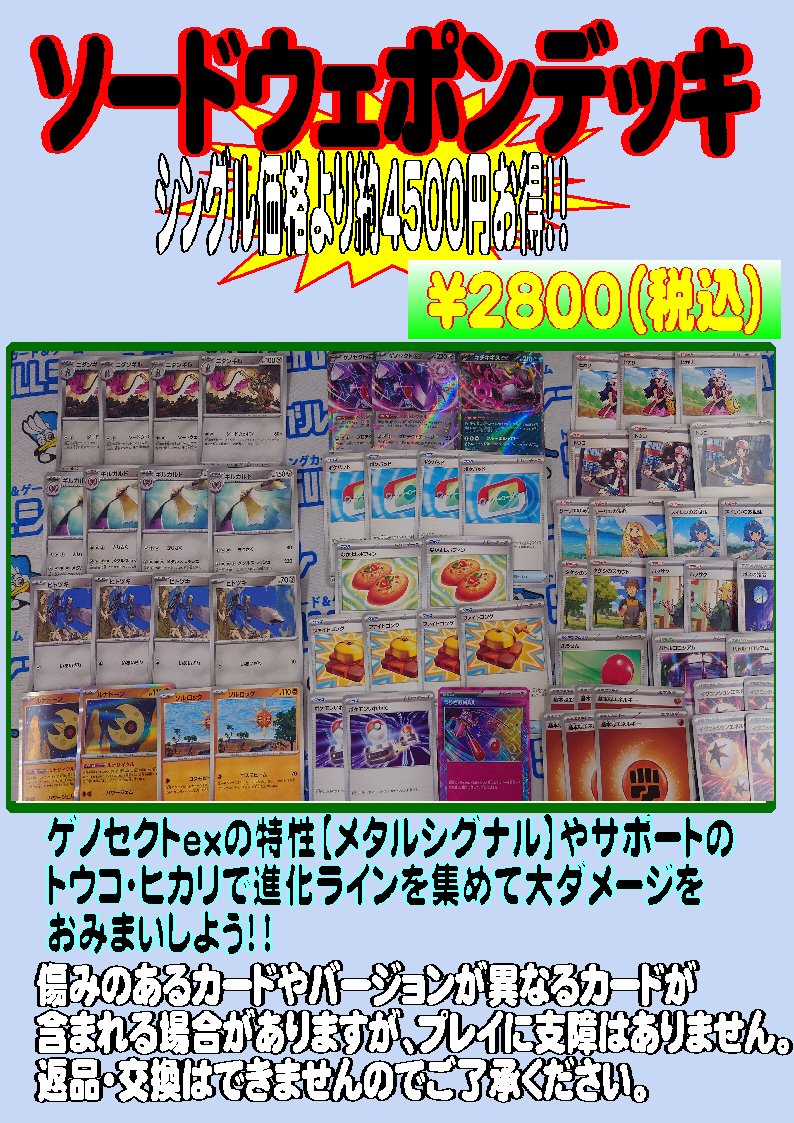 シーガル郡山店です! ポケモンカード ショーケースにて 構築済みデッキ 作成しました! 新弾 #ムニキスゼロ のニダンギル進化ラインが活躍する ソードウエポンデッキ シングルで購入するよりもお得です!! ご来店お待ちしております☺ #シーガル郡山店デッキ販売