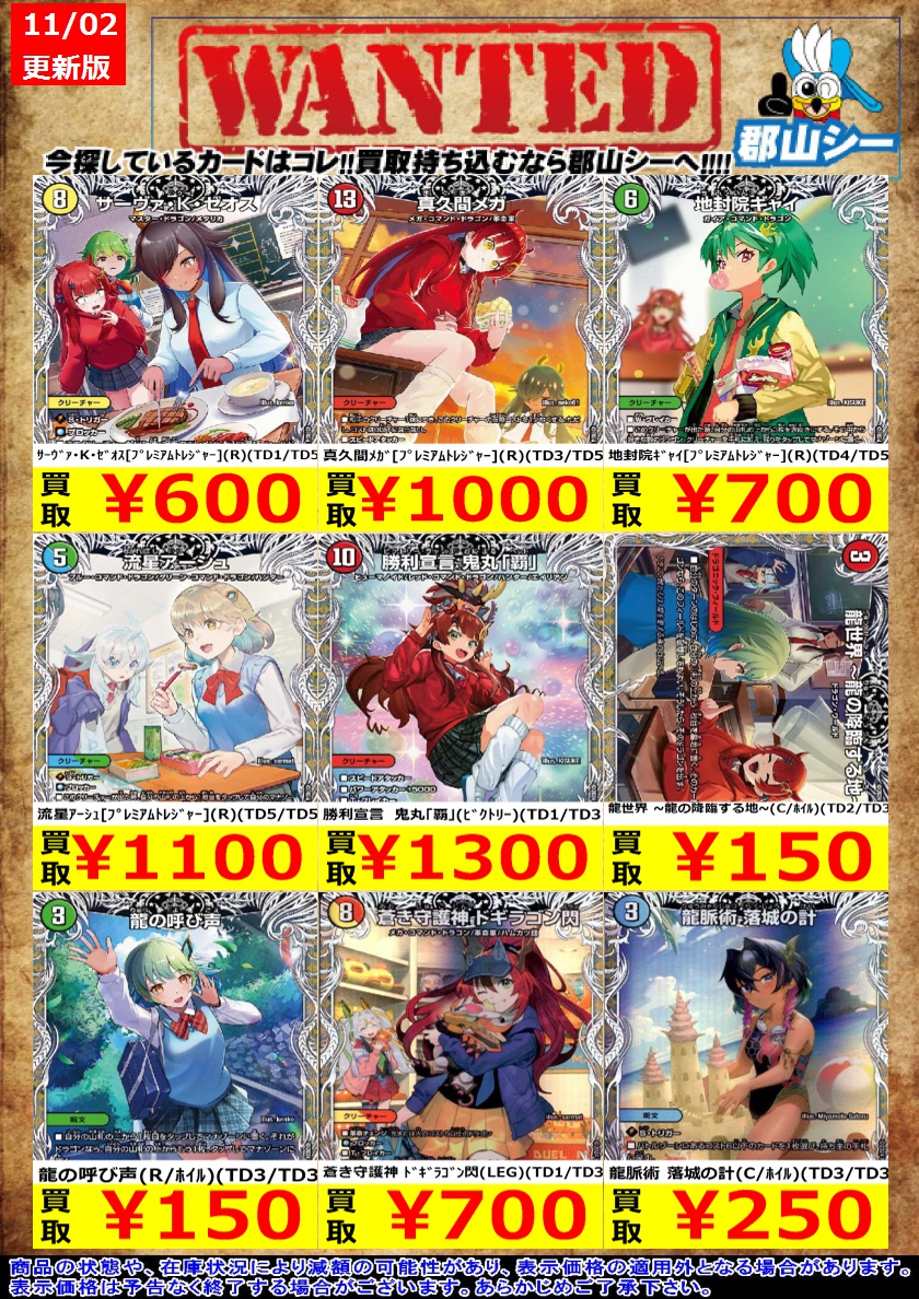 シーガル郡山店デュエマお買取り情報!! ※商品の状態や在庫状況により減額の可能性があり、表示価格の適用外となる場合がございます。 闇王ゼーロ(VR)(TD3/TD5) ¥250 龍脈術 落城の計(C/ホイル)(TD3/TD3) ¥250 斬隠蒼頭龍バイケン(SR)(PR3/PR5)[ドラゴン娘] ¥350