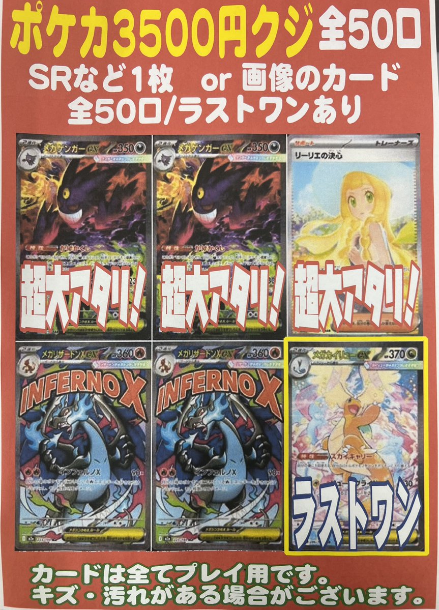 🌈ポケカ3500円くじ🌈 全50口 販売開始しました‼️ メガゲンガーやリーリエの決心SARが当たっちゃいます✨️ 是非ぜひお試しください(*´ω`*)