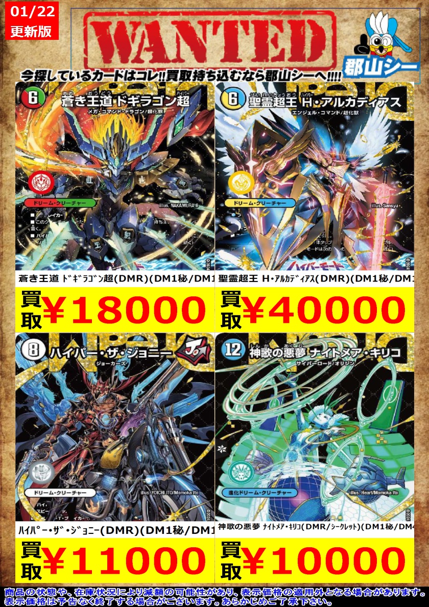シーガル郡山店デュエマお買取り情報!! ※商品の状態や在庫状況により減額の可能性があり、表示価格の適用外となる場合がございます。 ハイパー・ザ・ジョニー(DMR)(DM1秘/DM1) ¥11,000 蒼き王道 ドギラゴン超(DMR)(DM1秘/DM1) ¥18,000