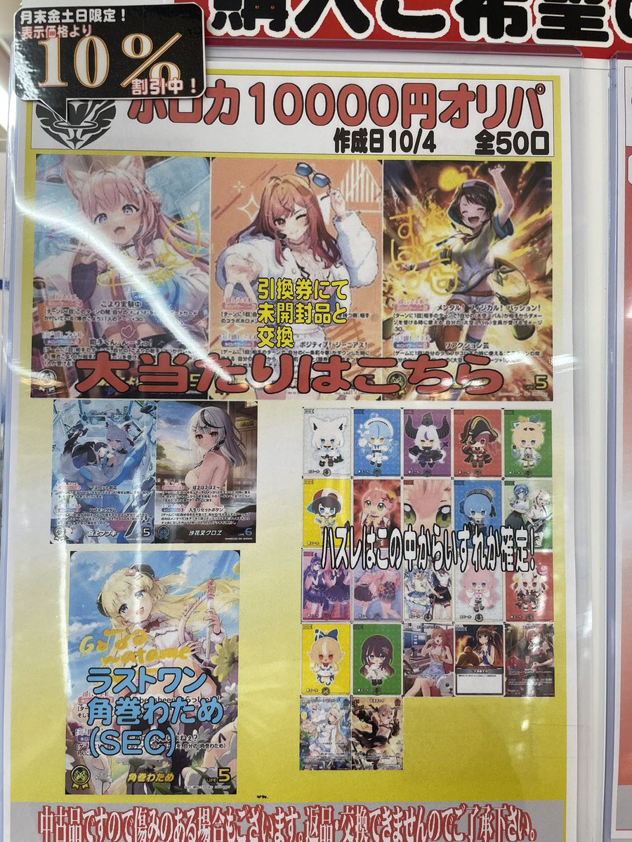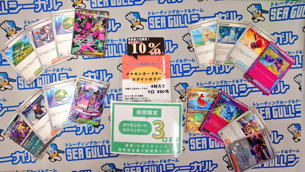 シーガル郡山店です! 本日より プレミアムフライデー 月末金土日10%off! ポケモンカード ログインオリパ 通常1口まで300円のところ 10%オフでさらに期間限定 3口まで ご購入いただけます! お求めの際はレジにてお声かけください😊 画像は封入一例です!