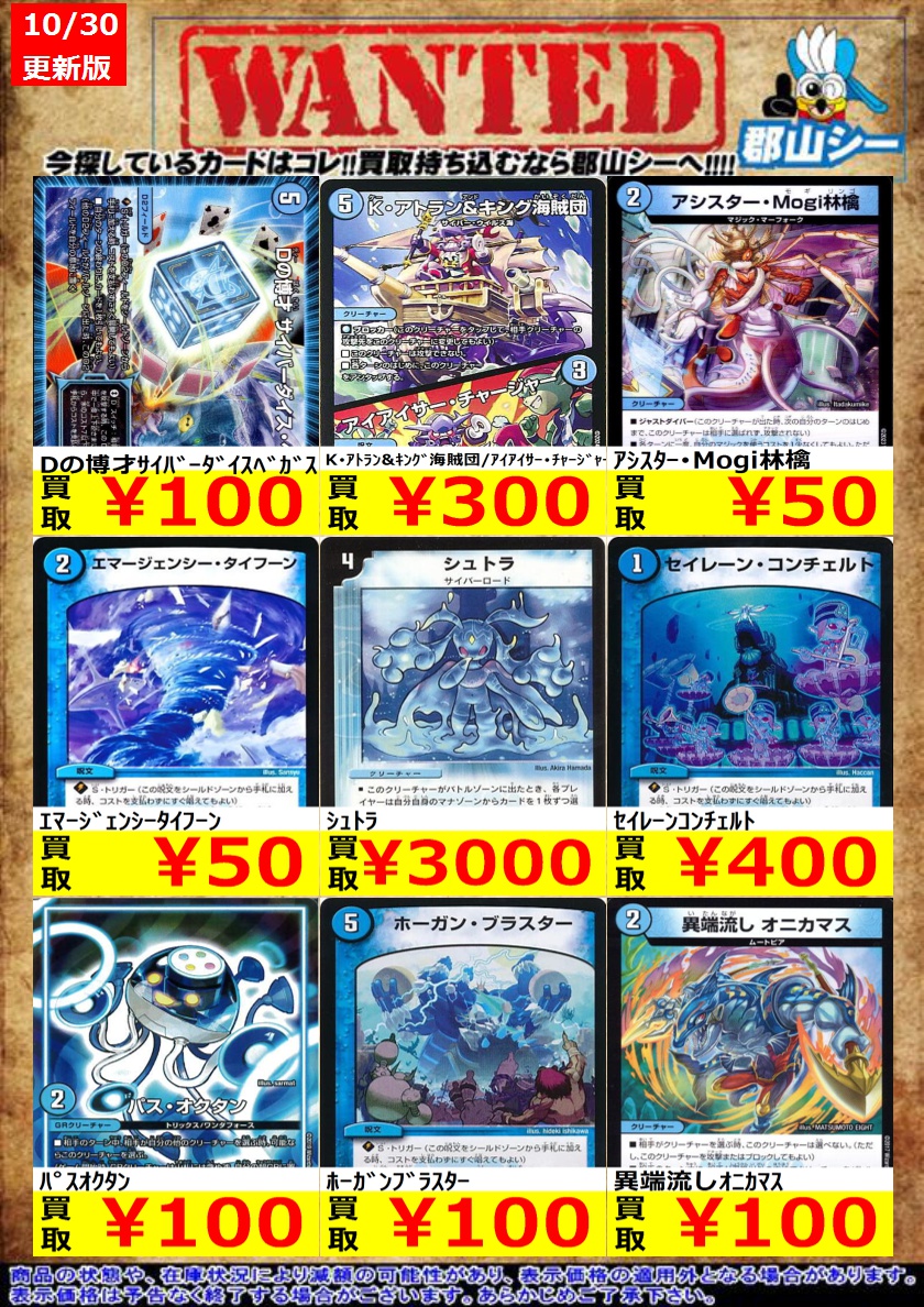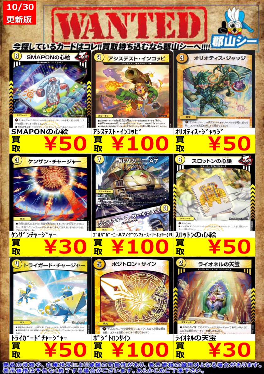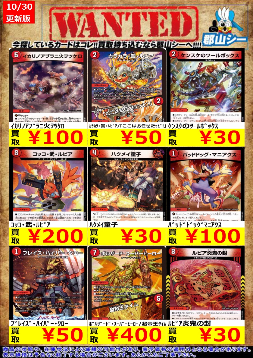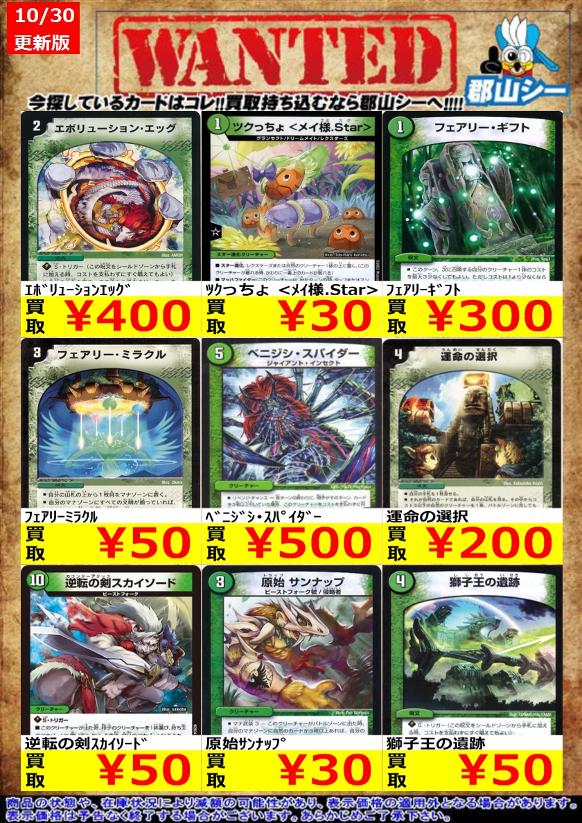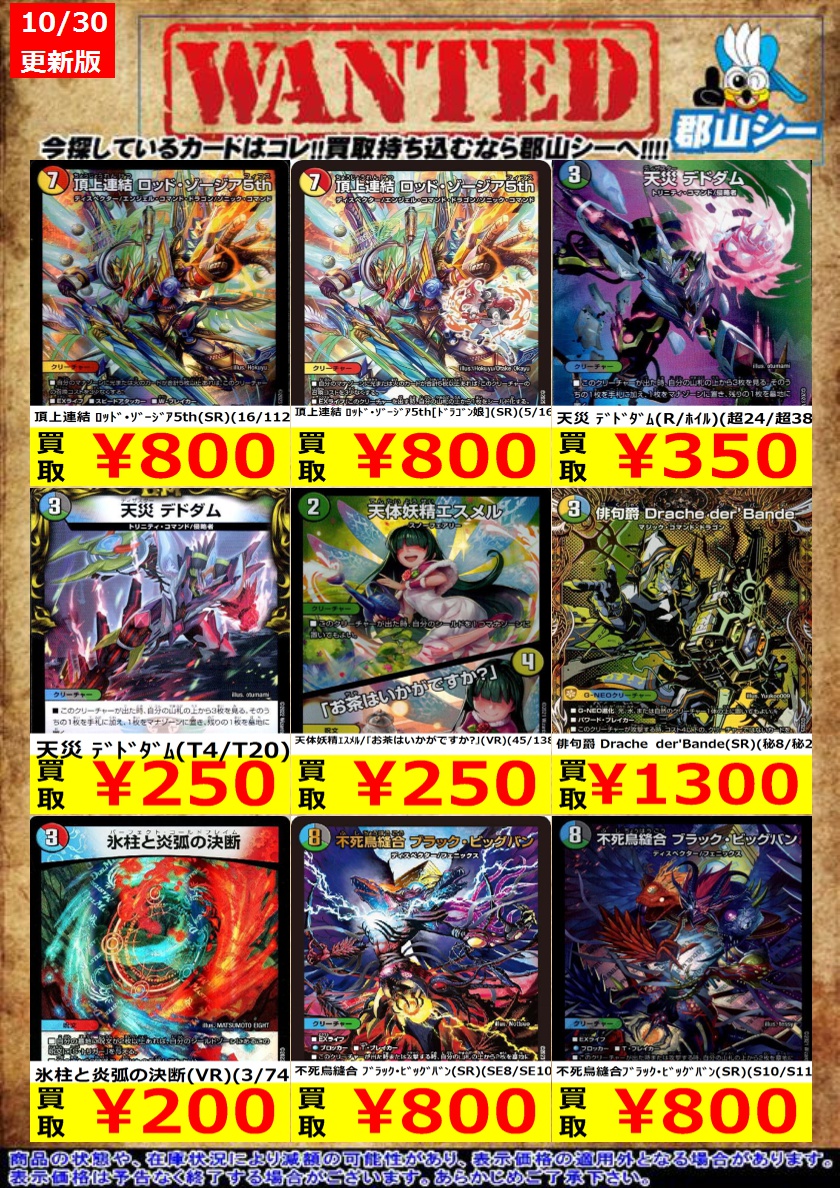 シーガル郡山店デュエマノーマルお買取り情報!! ※商品の状態や在庫状況により減額の可能性があり、表示価格の適用外となる場合がございます。 伊達人形ナスロスチャ ¥30 ヴィオラの黒像 ¥30 ロスト・チョイス ¥30