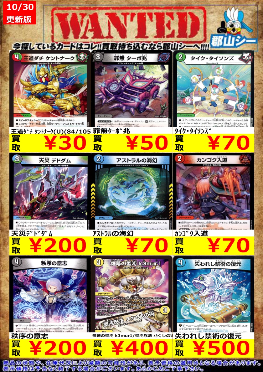 シーガル郡山店デュエマノーマルお買取り情報!! ※商品の状態や在庫状況により減額の可能性があり、表示価格の適用外となる場合がございます。 王道ダチ ケントナーク(U)(84/105) ¥30 罪無ターボ兆 ¥50 タイク・タイソンズ ¥70