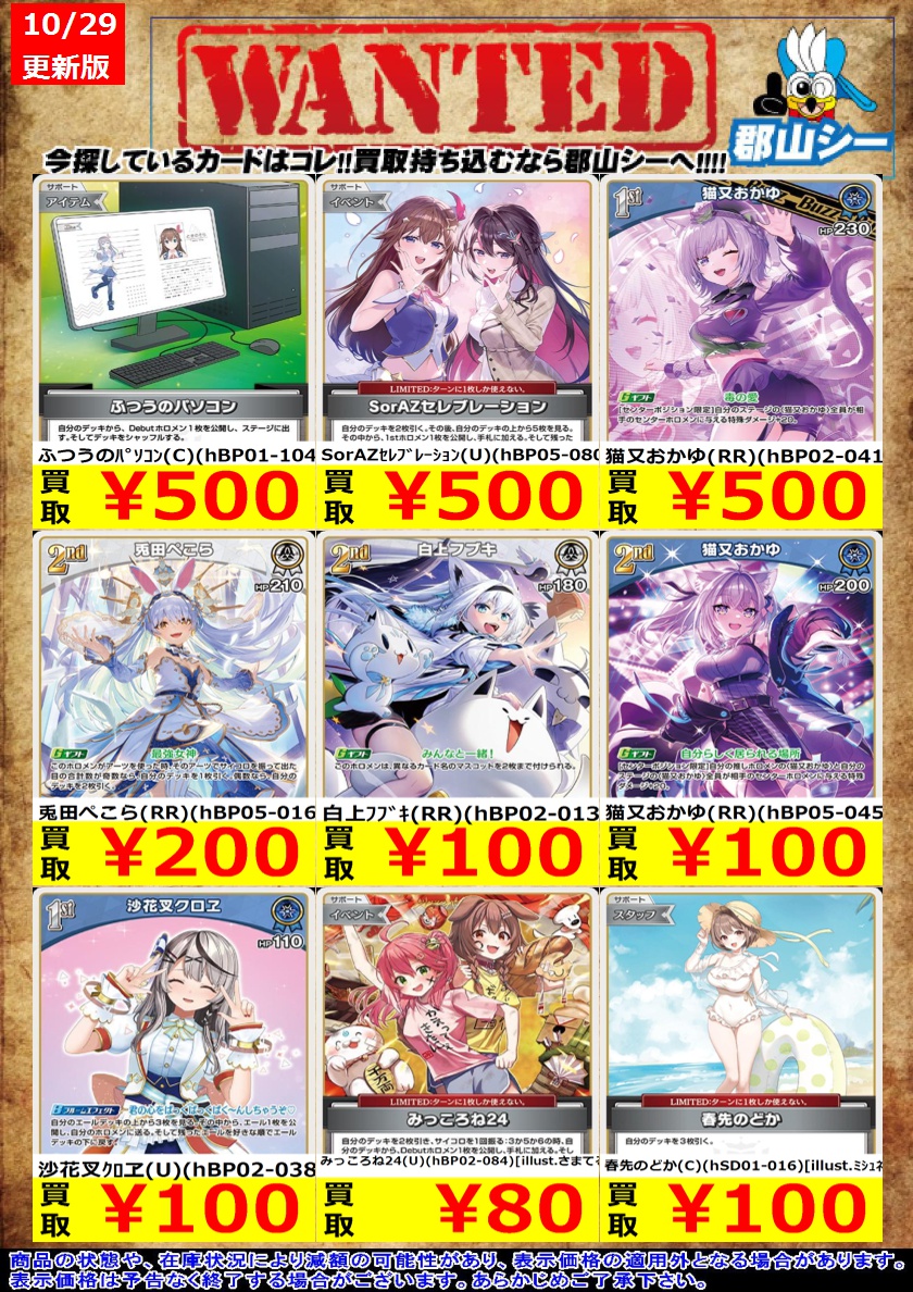 シーガル郡山店ホロライブOCGお買取り情報!! ※商品の状態や在庫状況により減額の可能性があり、表示価格の適用外となる場合がございます。 白銀ノエル(OSR)(hBP05-001) ¥200 猫又おかゆ(OSR)(hBP05-004) ¥200 星街すいせい(OSR)(hBP01-007) ¥1,700
