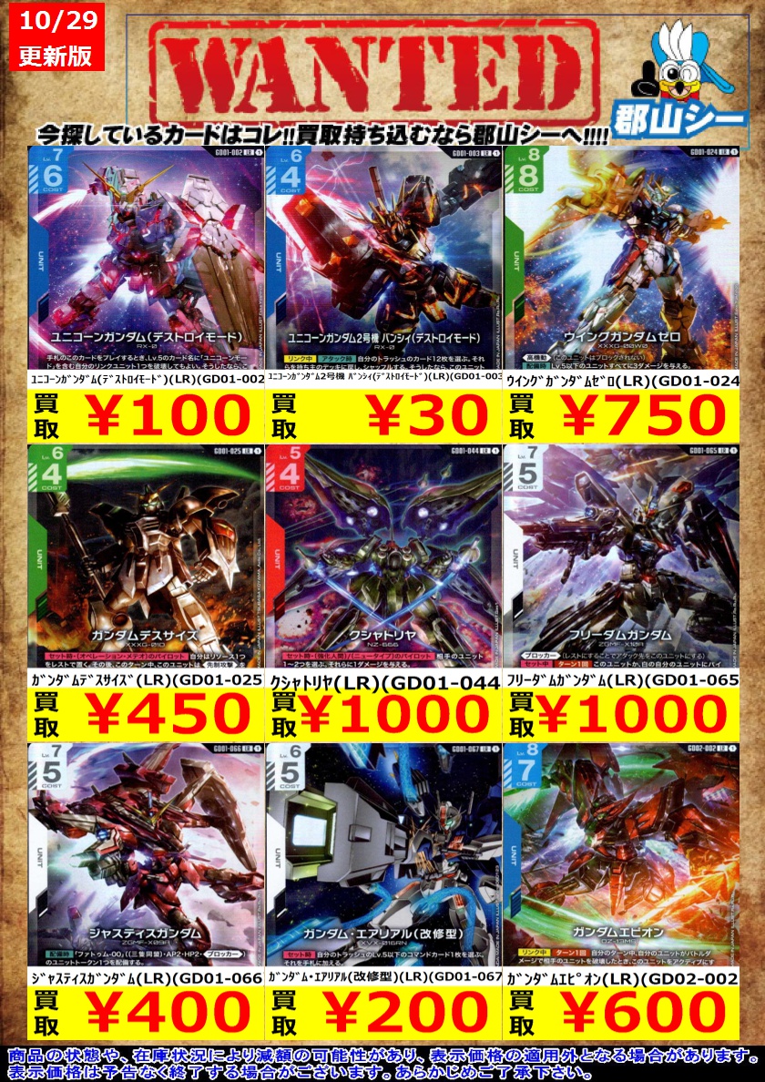 シーガル郡山店ガンダムCGお買取情報!! GQuuuuuuX(オメガ・サイコミュ起動時)(LR)(GD02-038) ¥400 ガンダムエピオン(LR)(GD02-002) ¥600 ガンダム・グシオンリベイク(LR)(GD02-055) ¥750 #ガンダムカードゲーム #GCG #シーガル郡山店