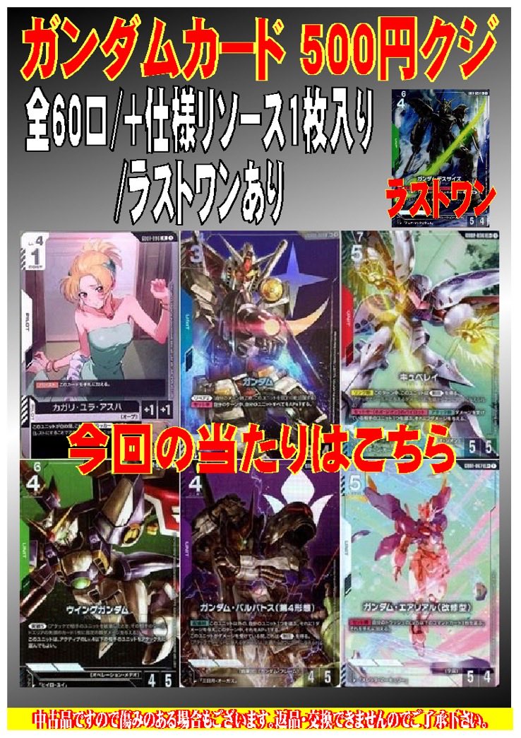 こんにちは(」・ω・) シーガル郡山店の田中です。 ガンダムカード 500円クジを作成致しました。 ご来店お待ちしております( *°∀°* )