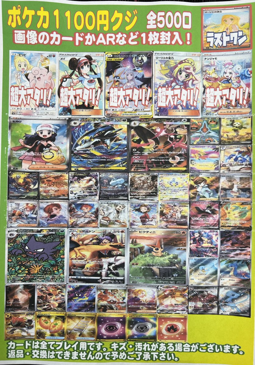 🌈ポケカ1100円くじ🌈 全500口 新しく展開致しました‼️ 大当たりにはリーリエやメイ、ナンジャモなど大人気キャラを揃えております✨️ 是非ぜひお試しください(*´ω`*)