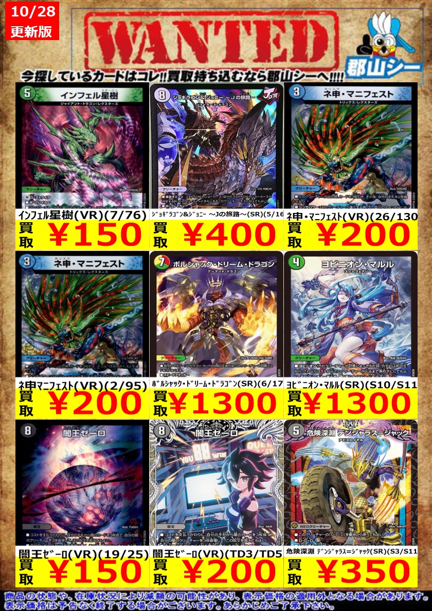 シーガル郡山店デュエマお買取り情報!! ※商品の状態や在庫状況により減額の可能性があり、表示価格の適用外となる場合がございます。 堕チシ八叉ノ蛇神(SR)(S11/S11) ¥150 ボルシャック・ドリーム・ドラゴン(SR)(6/17) ¥1,300 天革の騎令嬢 ミラクルステラ(SR)(6/89) ¥2,500