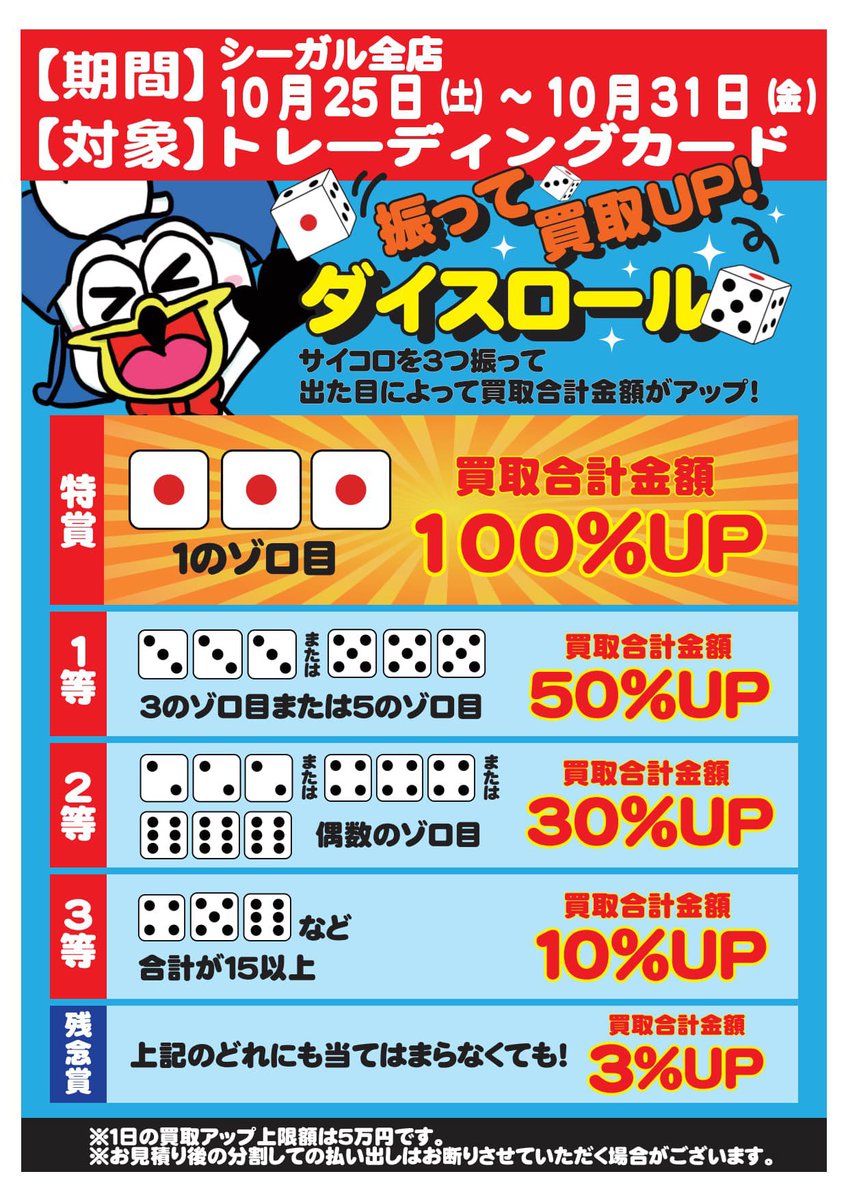 【買取キャンペーン実施中】 サイコロ振って買取UP! ダイスロール🎲 10/31(金)までシーガル全店で開催🎵 <対象> ・トレーディングカード 詳細は画像でご確認お願い致します。 皆様のご来店をお待ちしております‼️ #シーガル #買取アップ #ダイスロール #サイコロ