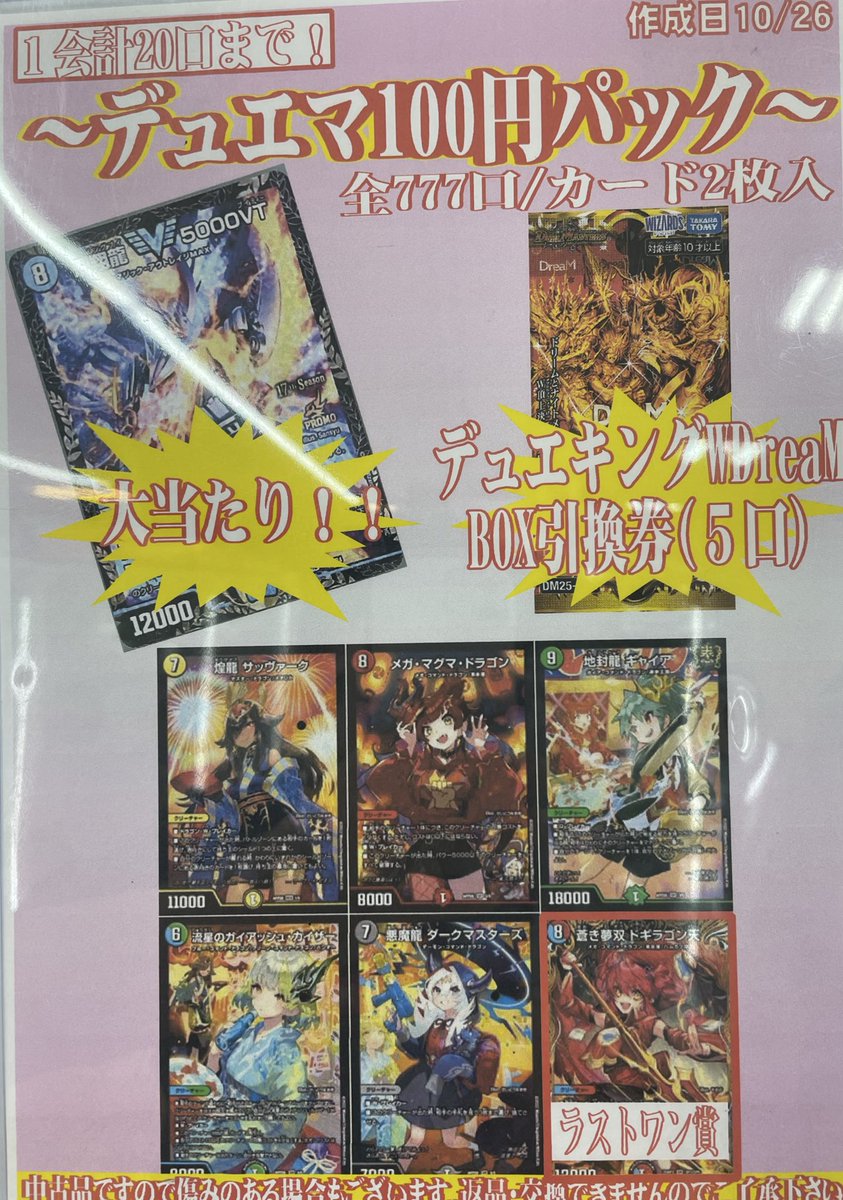 デュエマ100円パック作成いたしました❗️ 大当たりシングルカードの他にもデュエキングBOXの引換券がございます✨ ぜひつまんでみてください(*´ω`*)