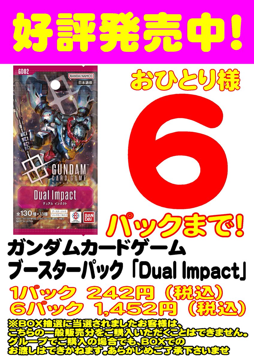 #ガンダムカードゲーム 最新弾 ブースターパック『Dual Impact』 在庫ございます❗️ お一人様6パックまでの販売とさせていただきます ※グループでご購入の場合でもBOXでのお渡しはできかねます。あらかじめご了承くださいませ。 皆様のご来店をお待ちしております😊