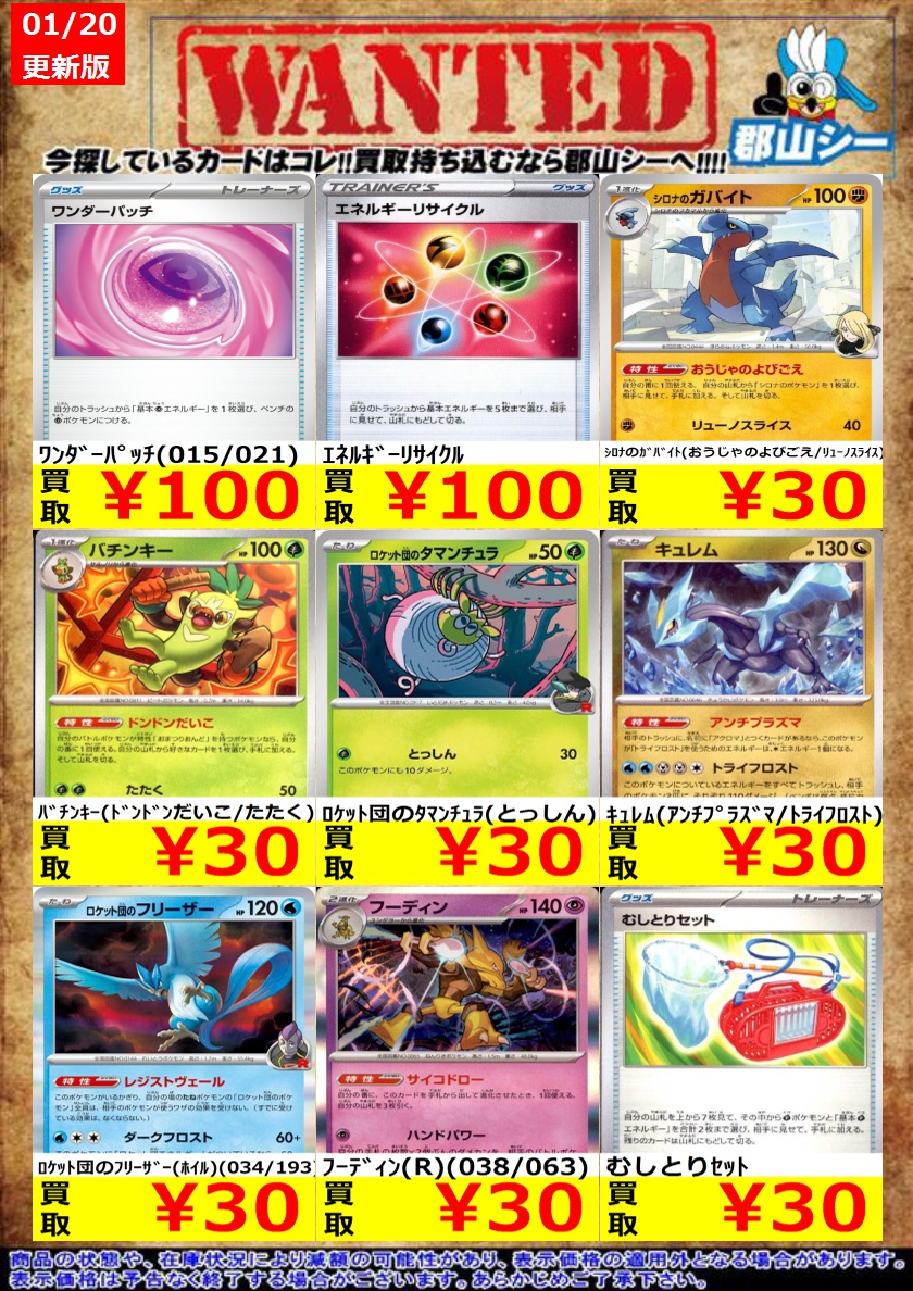 シーガル郡山店ポケカ数量限定お買取り情報更新です!よろしくお願いいたします! ※商品の状態や在庫状況により減額の可能性があり、表示価格の適用外となる場合がございます。 フーディン(R)(038/063) ¥30 ワンダーパッチ(015/021) ¥100 エネルギーリサイクル ¥100