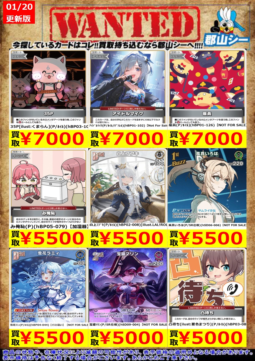 シーガル郡山店ホロライブOCGお買取り情報!! ※商品の状態や在庫状況により減額の可能性があり、表示価格の適用外となる場合がございます。 Promise(P/ホイル/パラレル)(hBP01-113)【Not For Sale】 ¥3,500 わためいと(P/ホイル)(hBP03-112)【NOT FOR SALE】 ¥3,500