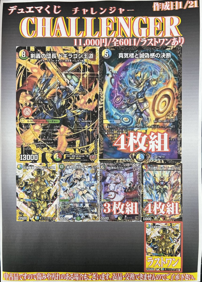 🌈デュエマくじCHALLENGER🌈 11,000円 全60口 販売開始しました‼️ 大当たりはドギラゴン王道シークレット・ペテンシープロモ4枚組と超豪華✨️ チャレンジお待ちしております(*´ω`*)