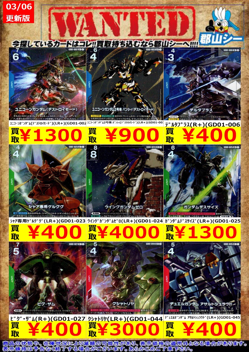 シーガル郡山店ガンダムCGお買取情報!! バスターガンダム(LR+)(GD01-046) ¥300 シャア専用ゲルググ(LR+)(GD01-023) ¥400 ユニコーンガンダム2号機 バンシィ(デストロイモード)(LR+)(GD01-003) ¥900