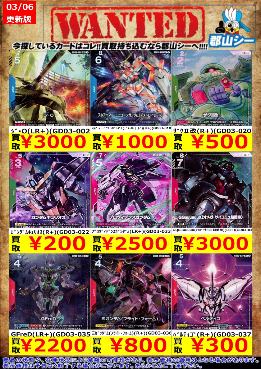シーガル郡山店ガンダムCGお買取情報!! Ξガンダム(フライト・フォーム)(R+)(GD03-036) ¥800 ゼハート・ガレット(R+)(GD03-094) ¥800 フルアーマー・ユニコーンガンダム(デストロイモード)(U+)(GD03-010) ¥1,000