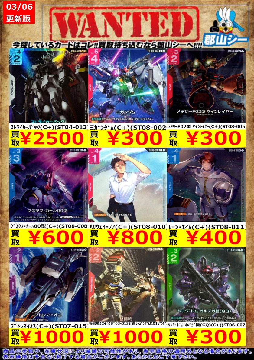 シーガル郡山店ガンダムCGお買取情報!! ゲルググ(GQ)(C+)(ST06-004) ¥100 キラ・ヤマト(C+)(ST04-010) ¥700 三日月・オーガス(C+)(ST05-010) ¥1,000