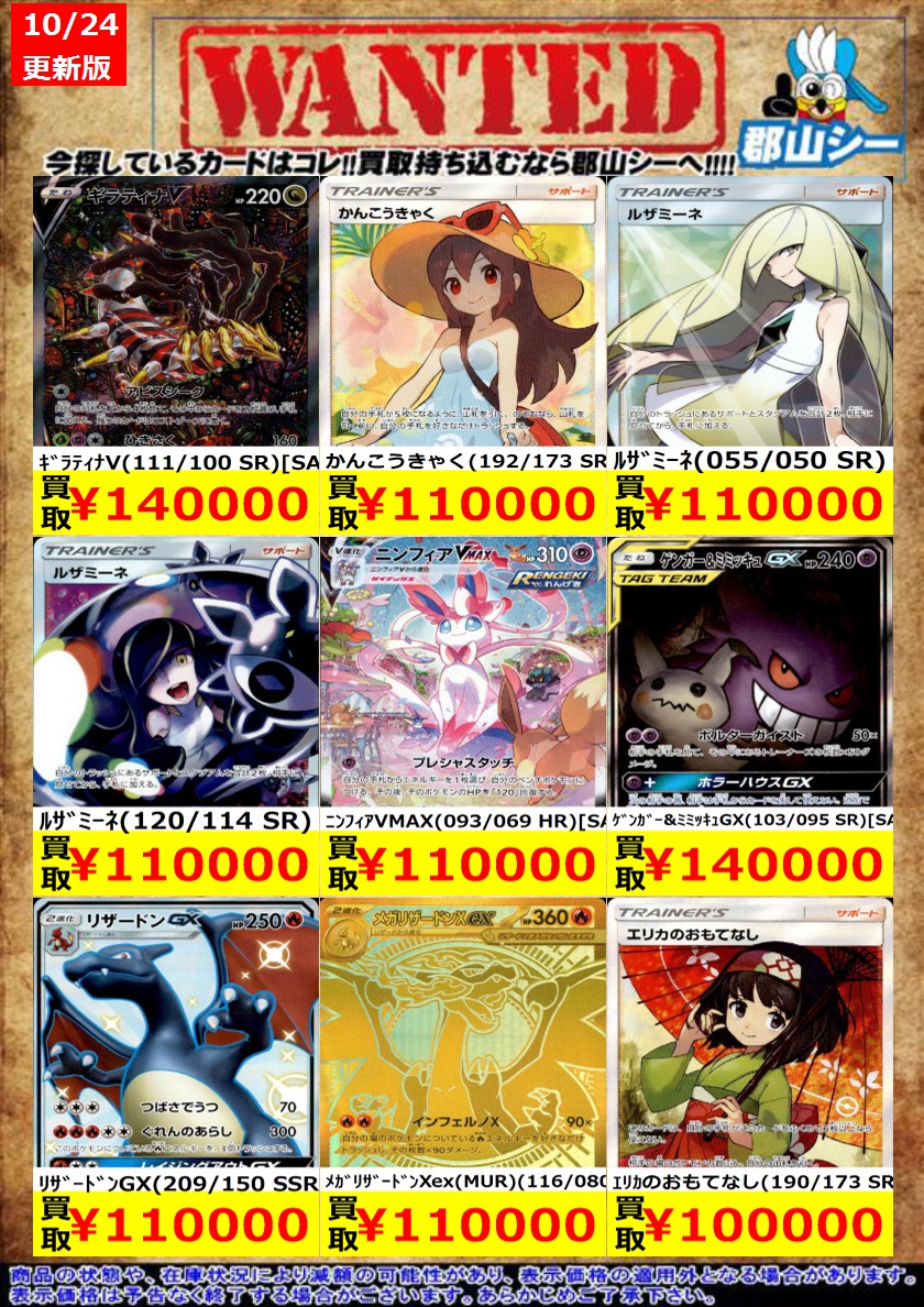 シーガル郡山店ポケカ数量限定お買取り情報更新です!よろしくお願いいたします! ※商品の状態や在庫状況により減額の可能性があり、表示価格の適用外となる場合がございます。 リザードンGX(052/051 SR) ¥70,000 こくばバドレックスVMAX(086/070 HR)[SA] ¥70,000