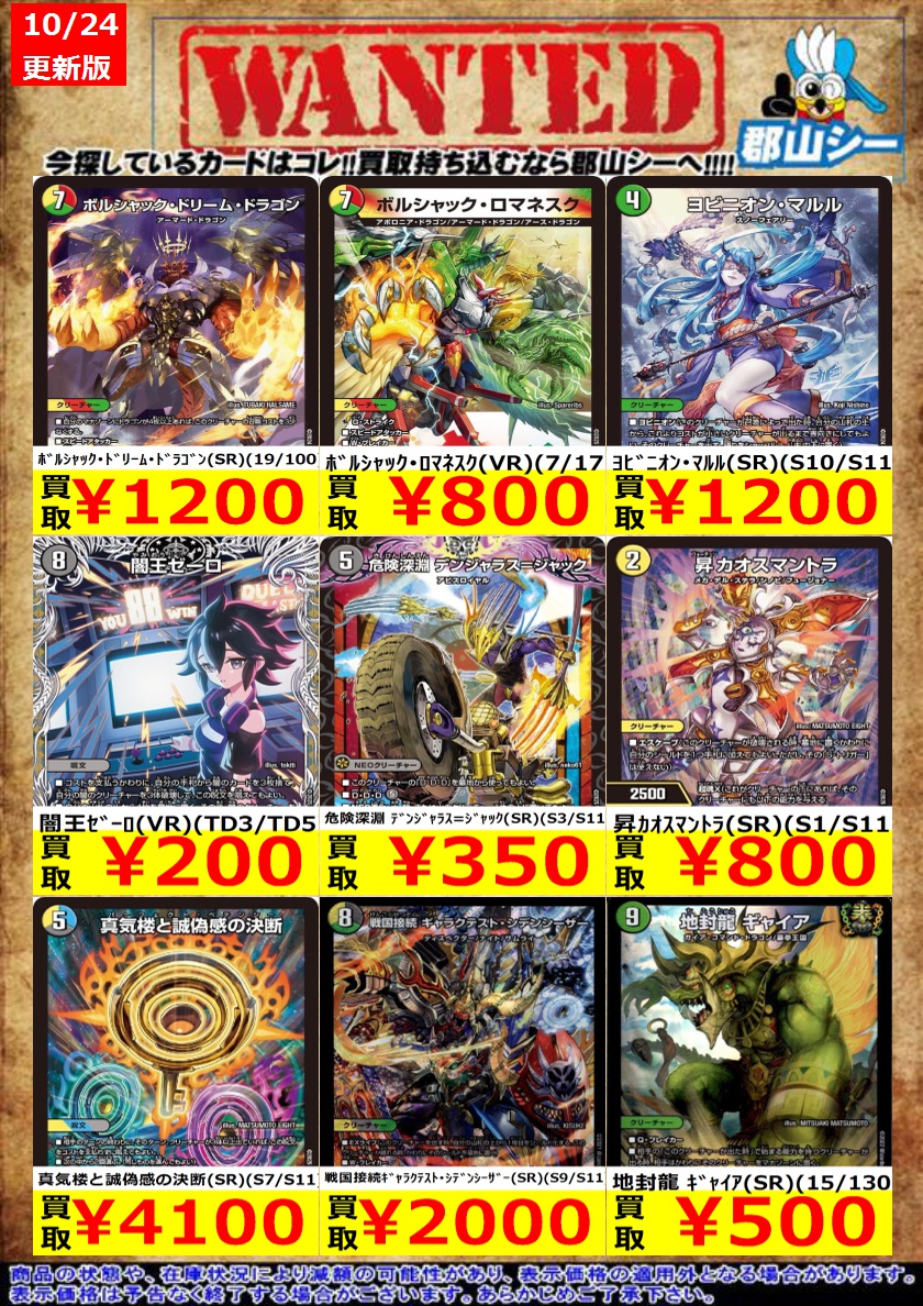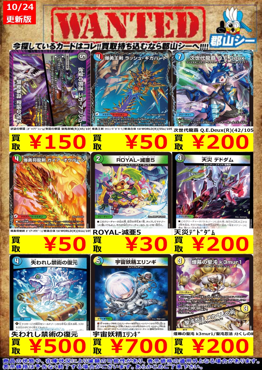 シーガル郡山店デュエマノーマルお買取り情報!! ※商品の状態や在庫状況により減額の可能性があり、表示価格の適用外となる場合がございます。 爆勇将龍剣 ガイア・オウバーン/龍覇合体 モルトWORLD(R)(61a/105) ¥50 欲望の邪道 ニガ=アブシューム/支配の邪道 獄鬼夜城(R)(45/105) ¥150