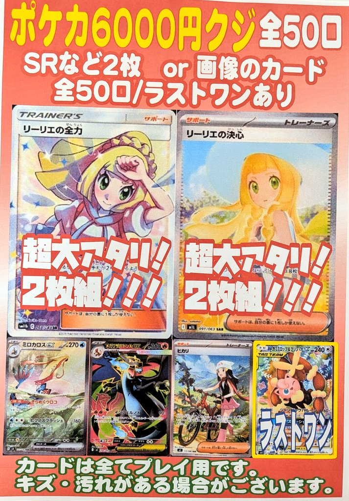 シーガル郡山店です! ポケカ6000円くじ作成いたしました! 今回の超大当たり枠はどちらもリーリエ2枚セット!!! よろしくお願いします‼️(ง🔥Д🔥)ง