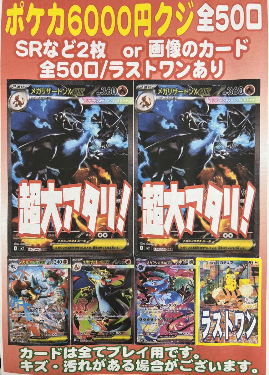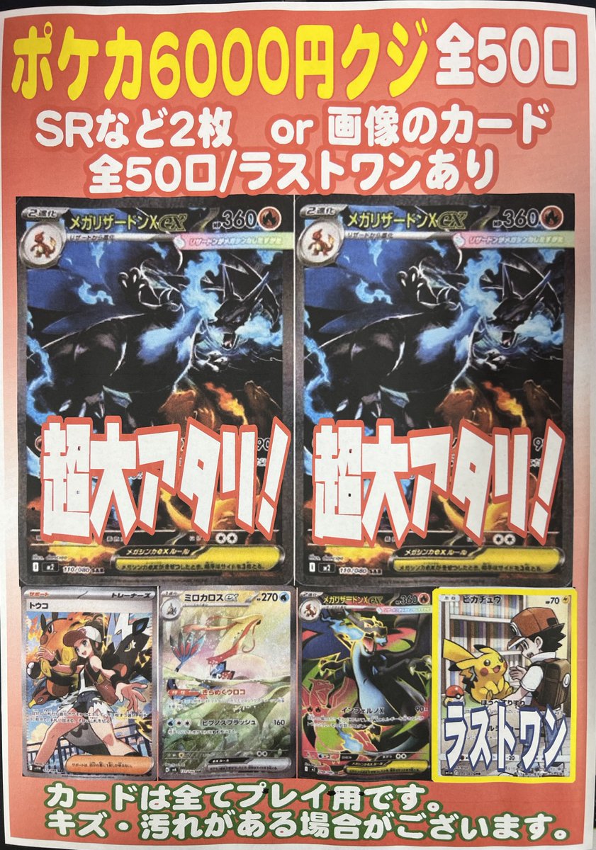 🌈ポケカ6000円くじ🌈 全50口 このあと16時より販売開始‼️ メガリザードンX ex SARを引き当てろ😁 ご来店お待ちしております(*´ω`*)