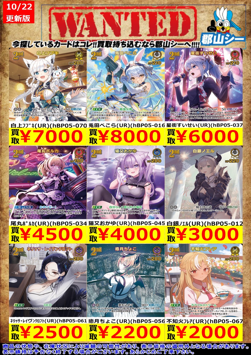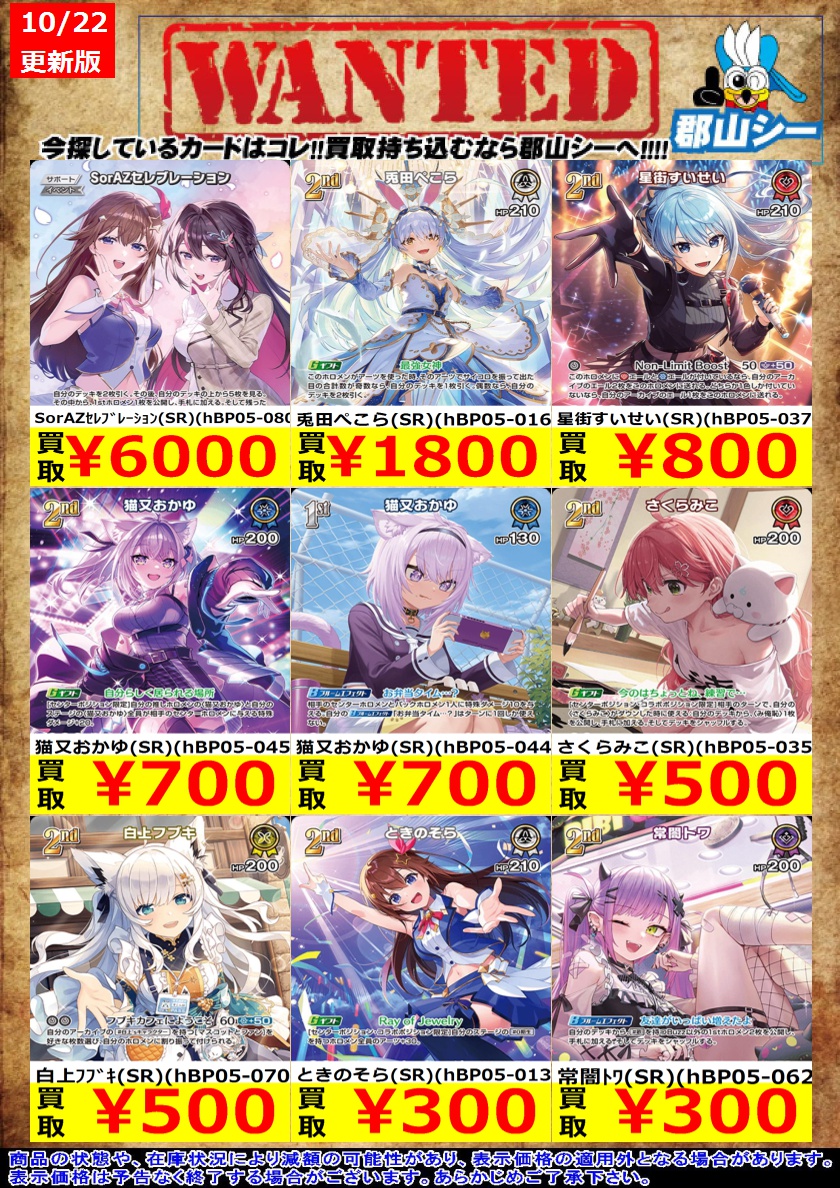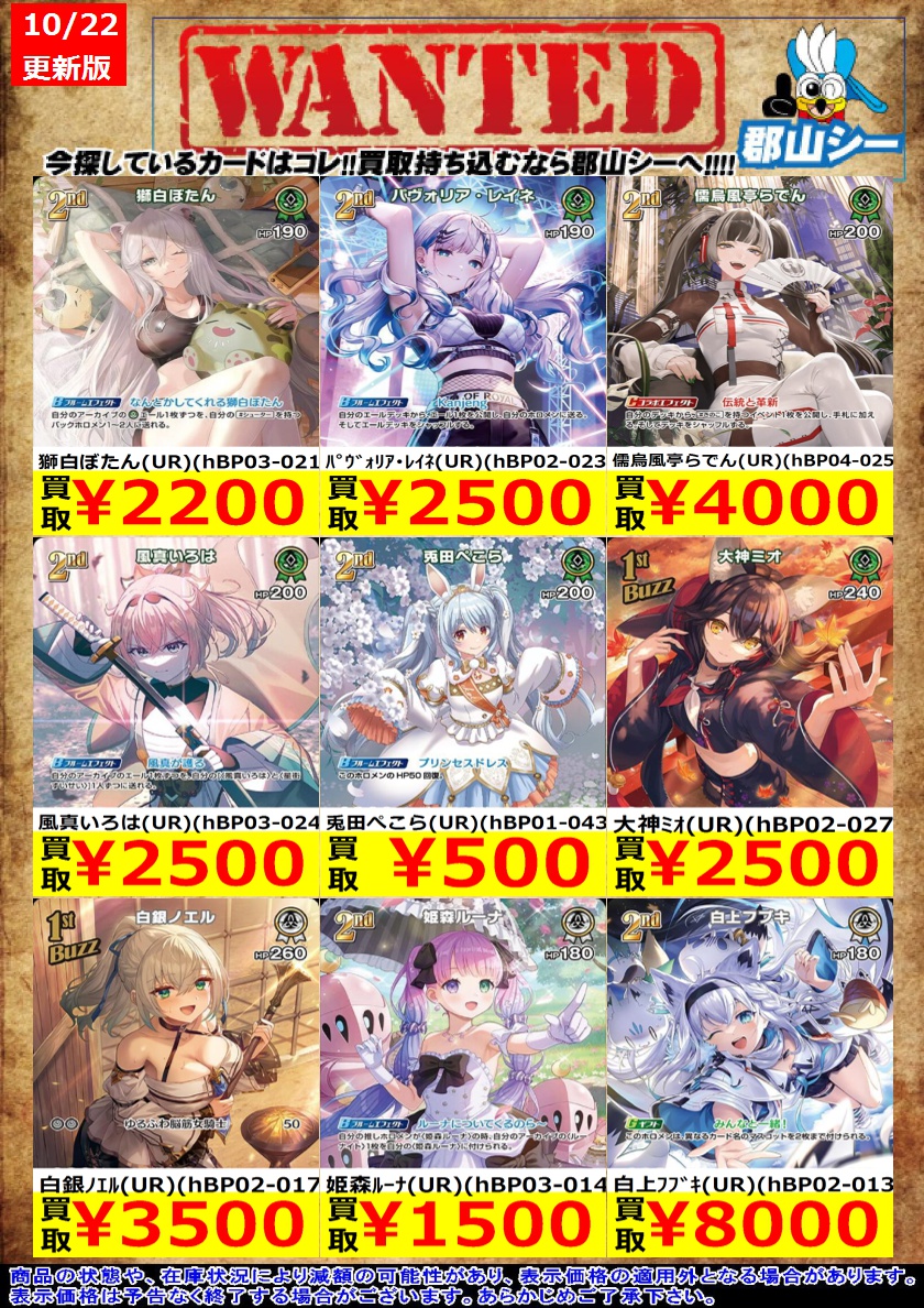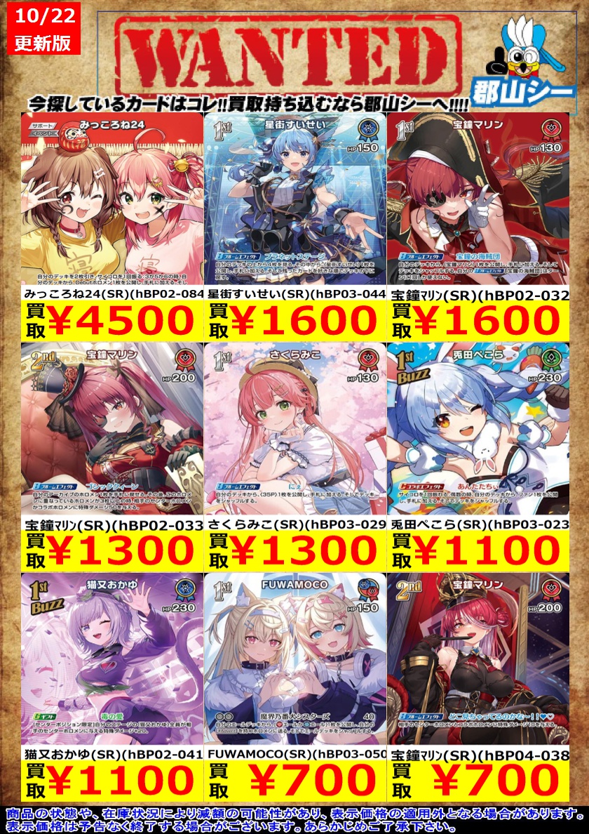 シーガル郡山店ホロライブOCGお買取り情報!! ※商品の状態や在庫状況により減額の可能性があり、表示価格の適用外となる場合がございます。 フワワ・アビスガード(UR)(hBP03-043) ¥2,200 大神ミオ(UR)(hBP02-027) ¥2,500 兎田ぺこら(UR)(hBP01-043) ¥500