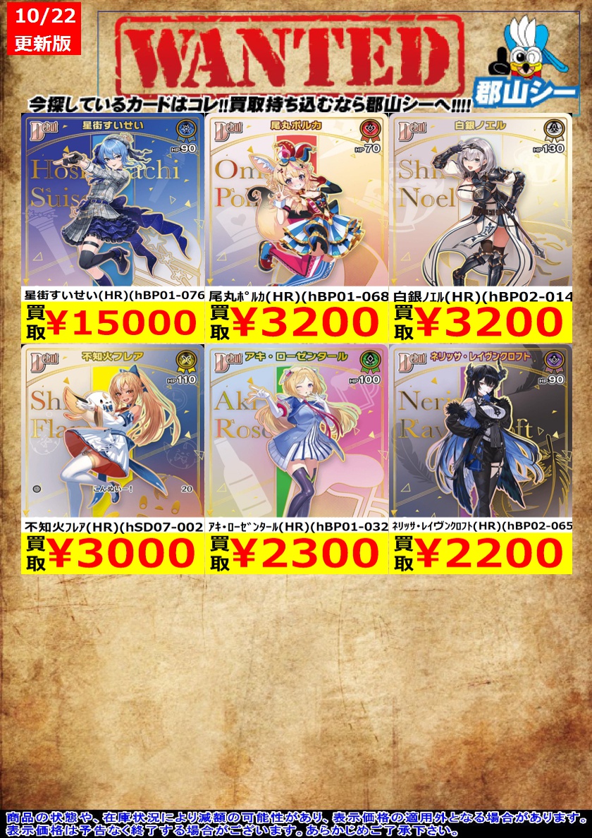 シーガル郡山店ホロライブOCGお買取り情報!! ※商品の状態や在庫状況により減額の可能性があり、表示価格の適用外となる場合がございます。 アキ・ローゼンタール(UR)(hBP05-027) ¥1,300 ネリッサ・レイヴンクロフト(UR)(hBP05-061) ¥2,500 白銀ノエル(UR)(hBP05-012) ¥3,000