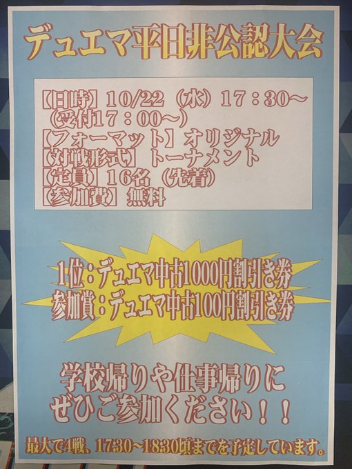 10月22日にデュエマ平日非公認大会を行います❗️ 参加費無料、優勝賞品はデュエマ中古1000円割引券です📷ご参加お待ちしております📷 🙇♂️