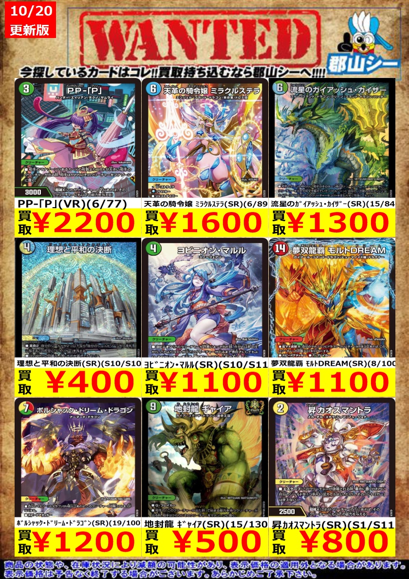 シーガル郡山店デュエマお買取り情報!! ※商品の状態や在庫状況により減額の可能性があり、表示価格の適用外となる場合がございます。 天革の騎令嬢 ミラクルステラ(SR)(6/89) ¥1,600 PP-「P」(VR)(6/77) ¥2,200 堕チシ八叉ノ蛇神(SR)(S11/S11) ¥150