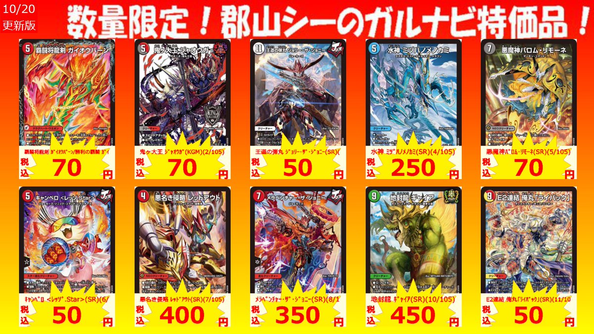 数量限定!郡山シー限定ガルナビ特価品 王道ダチ モンキッド(VR)(29/105) ¥70 水神 ミヅハノメノカミ(SR)(4/105) ¥250 仙足竜 ACE-Murked/冥昏の櫛(SR)(12/105) ¥250 #デュエマ #シーガル郡山 #アツアツ特価