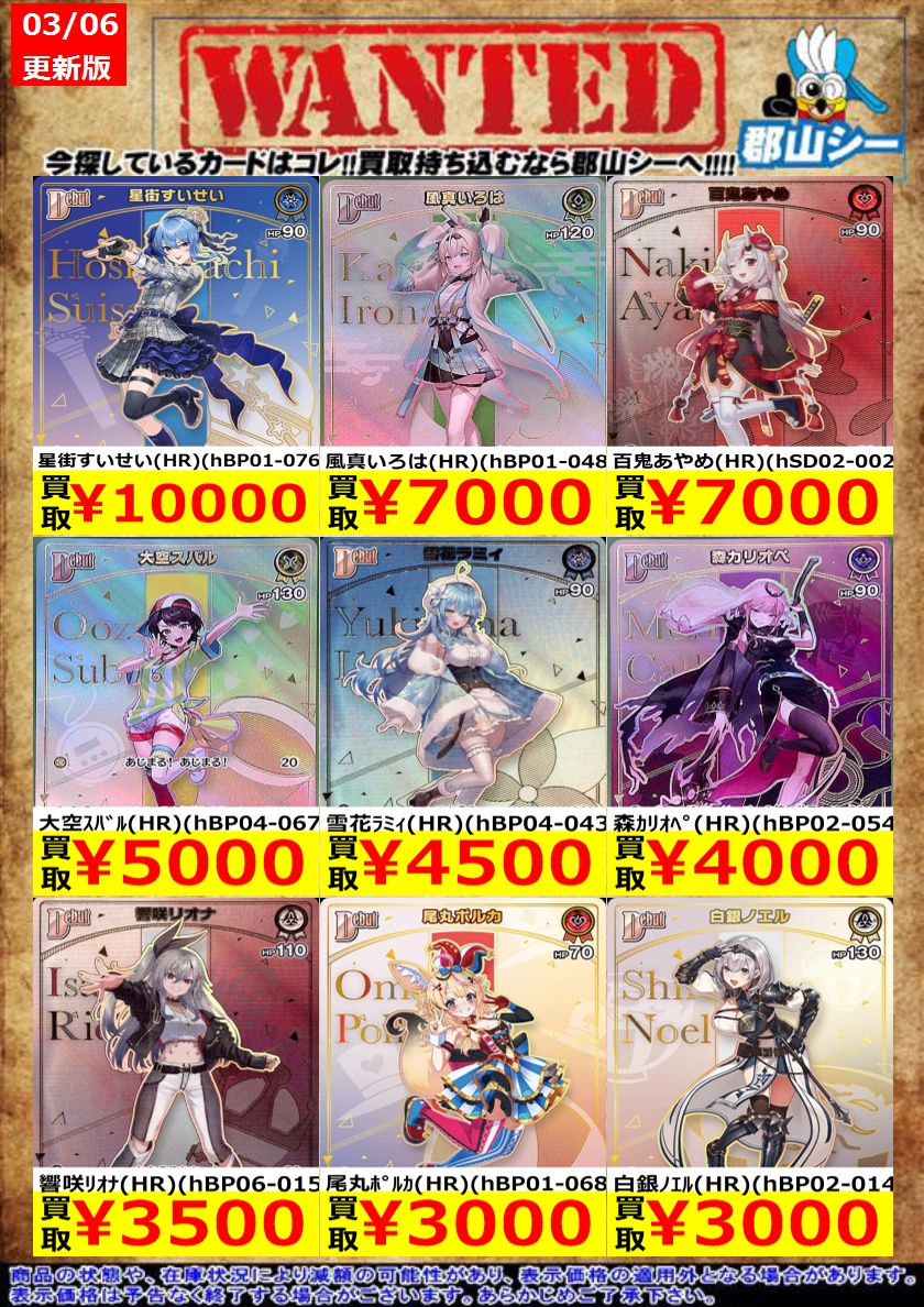 シーガル郡山店ホロライブOCGお買取り情報!! ※商品の状態や在庫状況により減額の可能性があり、表示価格の適用外となる場合がございます。 響咲リオナ(HR)(hBP06-015) ¥3,500 雪花ラミィ(HR)(hBP04-043) ¥4,500 風真いろは(HR)(hBP01-048) ¥7,000