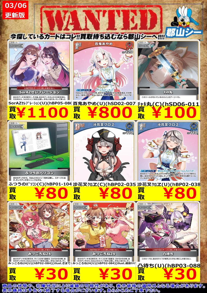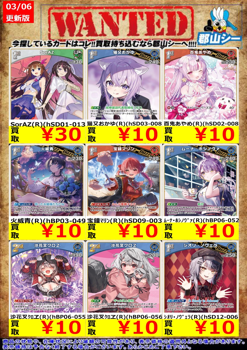 シーガル郡山店ホロライブOCGお買取り情報!! ※商品の状態や在庫状況により減額の可能性があり、表示価格の適用外となる場合がございます。 風真いろは(SR)(hSD06-007) ¥600 ラムダック(SR)(hBP06-083) ¥900 沙花叉クロヱ(SR)(hBP06-055) ¥800
