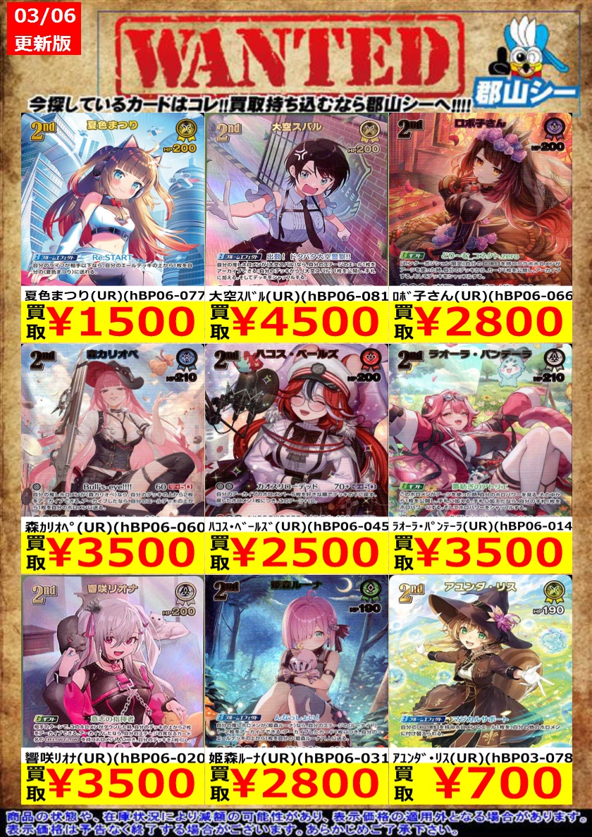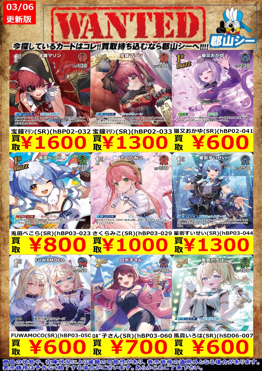 シーガル郡山店ホロライブOCGお買取り情報!! ※商品の状態や在庫状況により減額の可能性があり、表示価格の適用外となる場合がございます。 獅白ぼたん(UR)(hBP03-021) ¥3,000 大神ミオ(UR)(hBP02-027) ¥4,000 儒烏風亭らでん(UR)(hBP04-025) ¥5,000