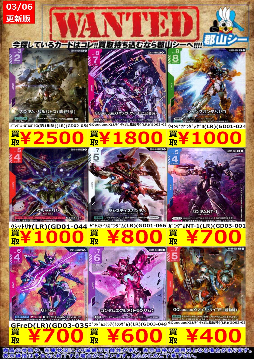 シーガル郡山店ガンダムCGお買取情報!! GQuuuuuuX(オメガ・サイコミュ起動時)(LR++)(GD02-038) ¥13,000 ガンダム・エアリアル(改修型)(LR++)(GD01-067) ¥13,000 ガンダム(LR++)(GD01-001) ¥8,000