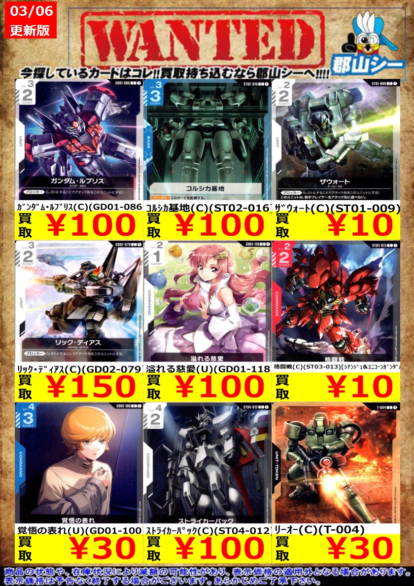 シーガル郡山店ガンダムCGお買取情報!! 格闘戦(C)(ST03-013)[シナンジュ&ユニコーンガンダム] ¥10 ザウォート(C)(ST01-009) ¥10 覚悟の表れ(U)(GD01-100) ¥30