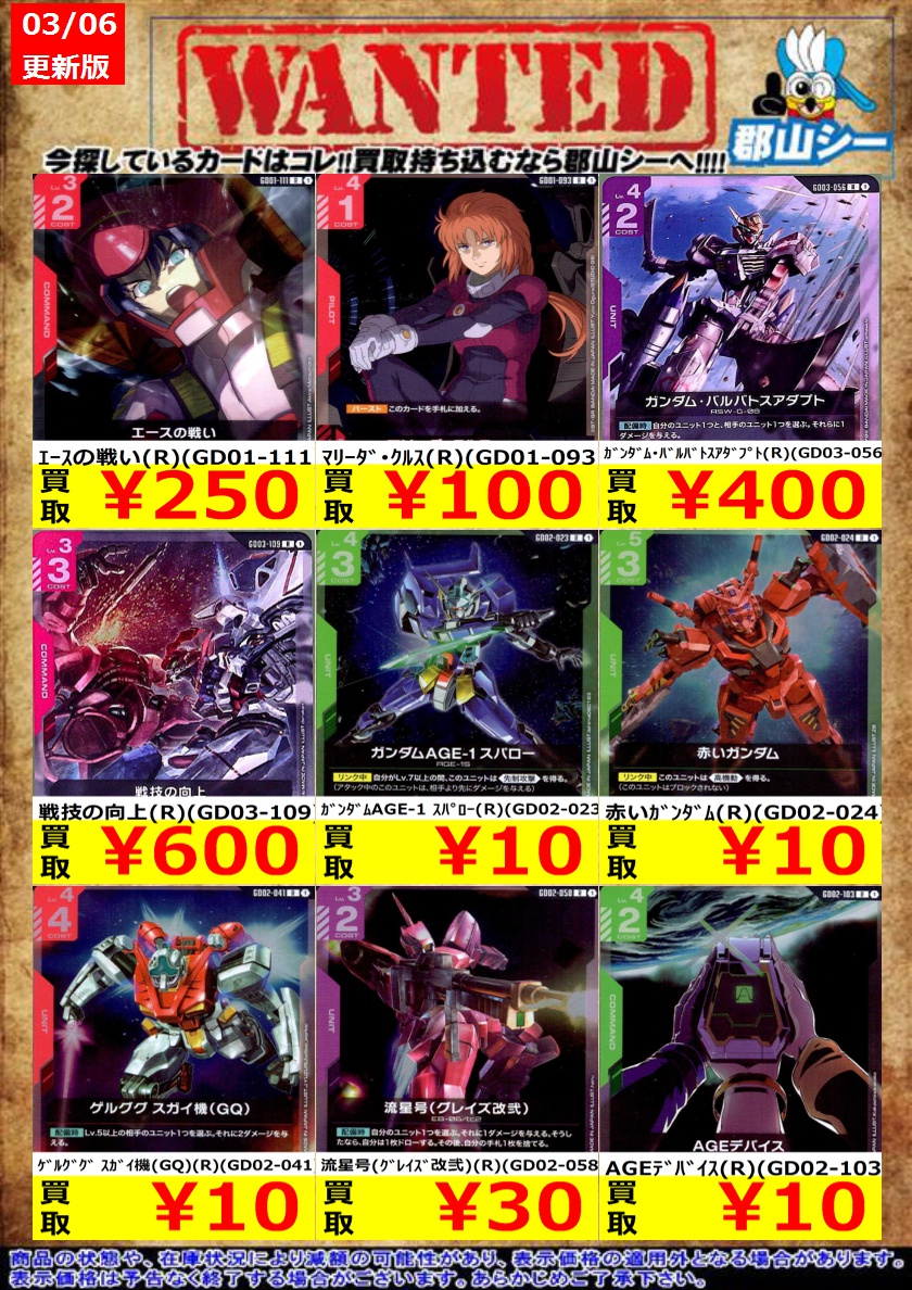 シーガル郡山店ガンダムCGお買取情報!! エースの戦い(R)(GD01-111) ¥250 戦技の向上(R)(GD03-109) ¥600 マリーダ・クルス(R)(GD01-093) ¥100
