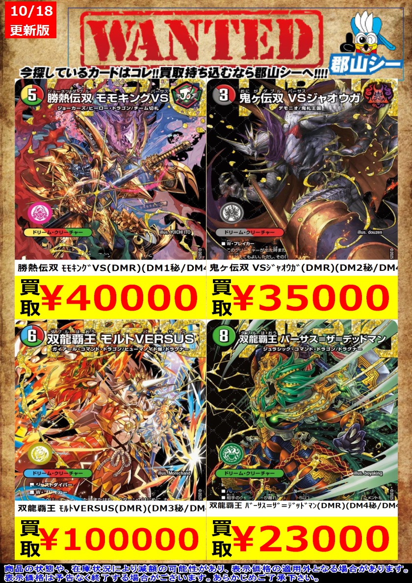 シーガル郡山店デュエマお買取り情報!! ※商品の状態や在庫状況により減額の可能性があり、表示価格の適用外となる場合がございます。 双龍覇王 バーサス=ザ=デッドマン(DM4秘/DM4) ¥23,000 鬼ヶ伝双 VSジャオウガ(DM2秘/DM4) ¥35,000 勝熱伝双 モモキングVS(DM1秘/DM4) ¥40,000